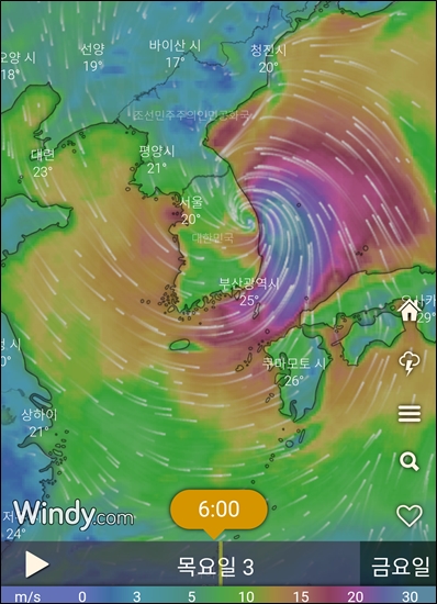 이건 부산에 상륙해서 원주를 지나간다는 예보...