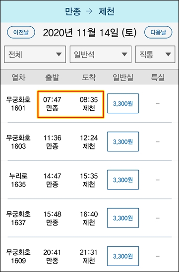 7시 47분 무궁화 8시 35분 제천역 도착