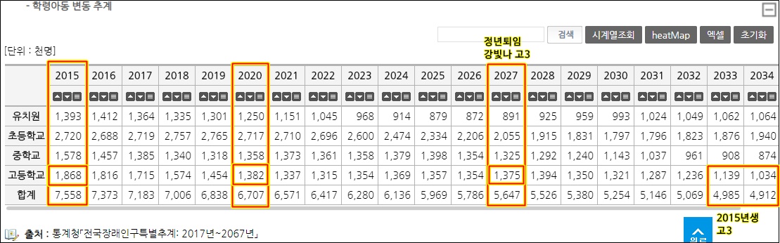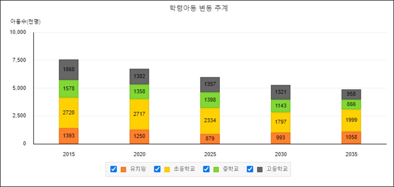 통계청 사이트에 가니 학령아동 변동 추계라는 것이 있다.