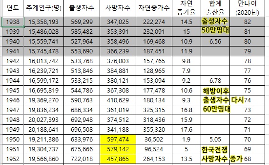 한국전쟁동안 사망자수가 늘어서 자연증가수가 확연히 떨어진다.