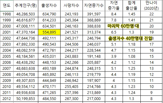 이에 따라 출생자수도 급각하여 2001년 55만명에서 2002년 바로 49만명대로 떨어진다.