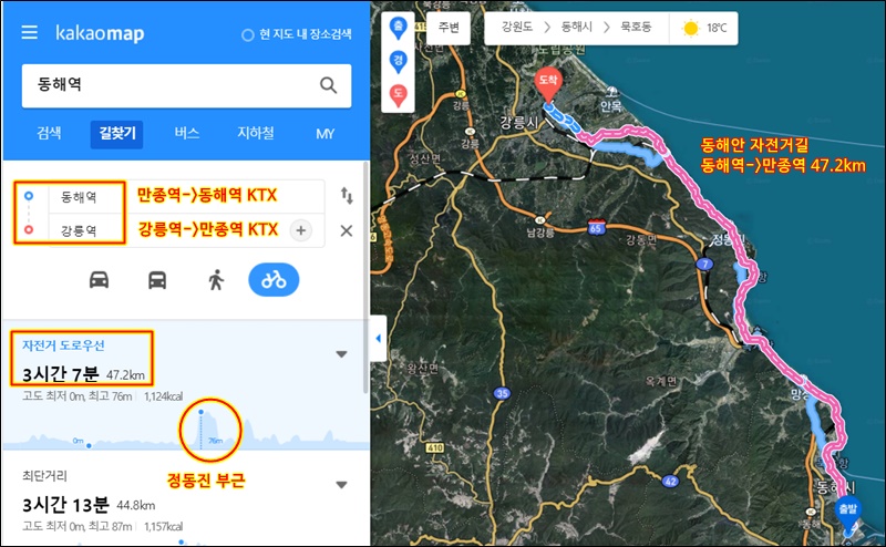 정동진~묵호 구간은 기차로 18분 소요.