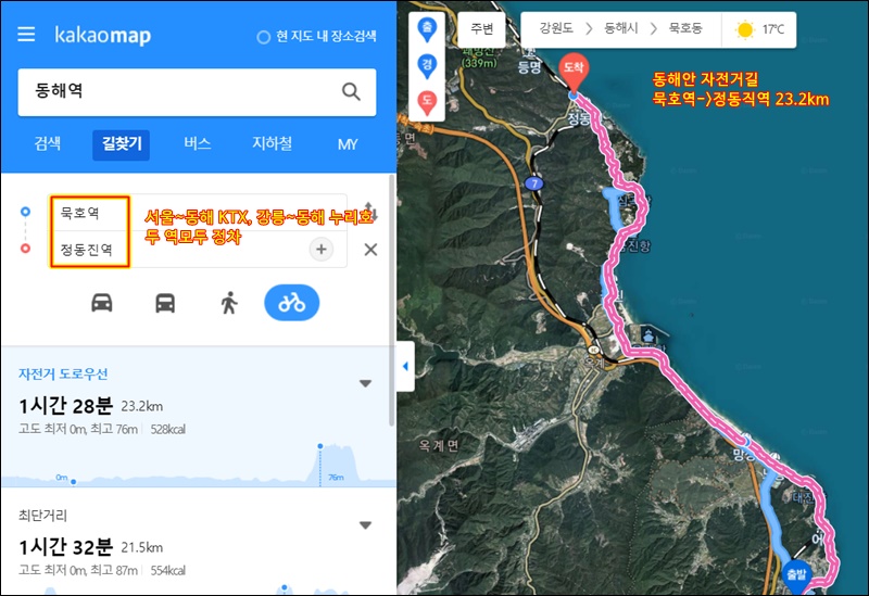 묵호역에서 정동진역까지 23km