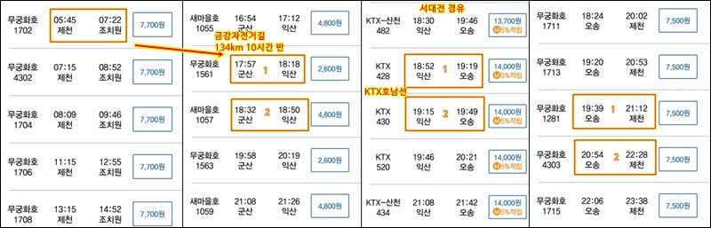 군산역->(장항선 무궁화호)->익산역->(KTX 호남선)->오송역->(충북선 무궁화호)->제천역