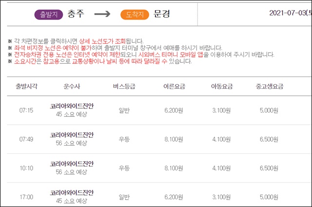 충주시외버스터미널 문경/점촌행 첫차 7:15