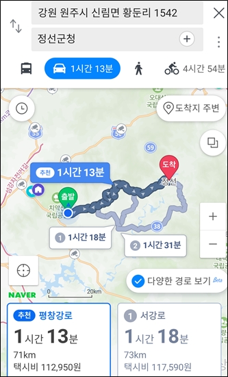 캠핑장에서 정선군청까지 1시간 조금 더 걸린다.
