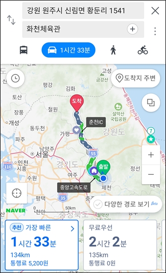 춘천 외곽에서 조금 헤매서 2시간 걸림.