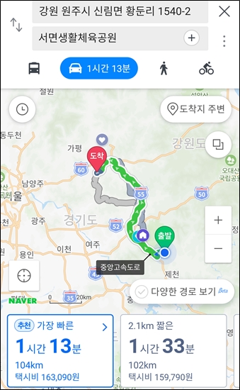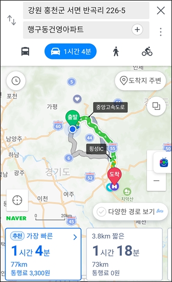 여주에서 홍청 서면까지 북쪽으로 가는 길 선택