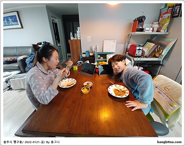 늦은 아침 먹는 남매