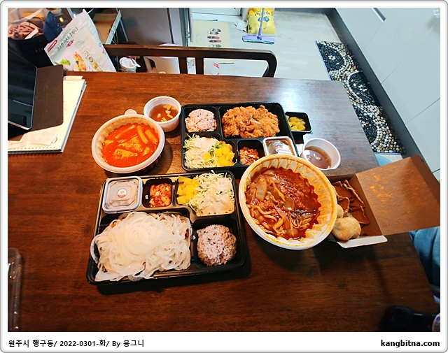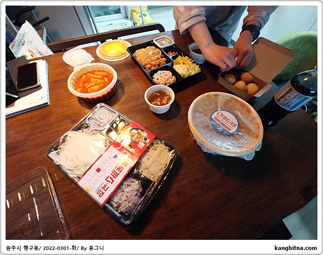 배달온 음식을 정리하는 딸.(사진찍기 위하여)
