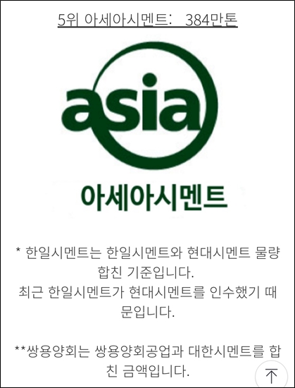 아세아 시멘트는 우리나라에서 넘버5