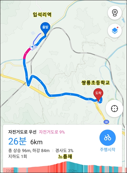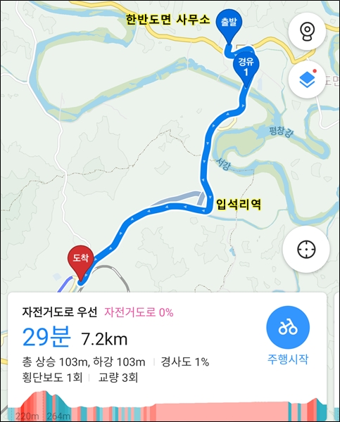 한반도면 사무소->입석리역->쌍룡공장->화병교->방울재->원동재