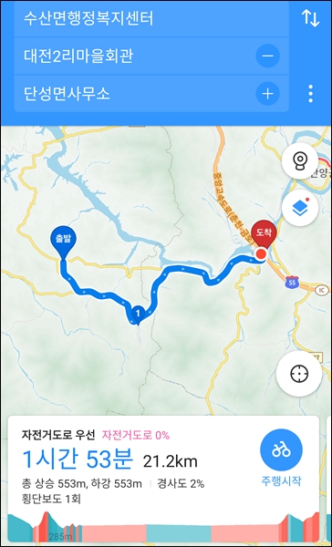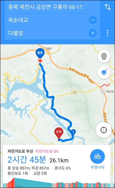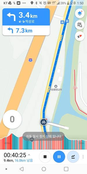 길을 헤매지 않기 위해 카카오맵 자전거주행로드 켬.