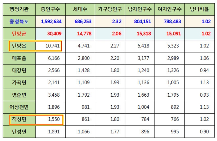 적성은 단양에서 인구가 가장 적은 면