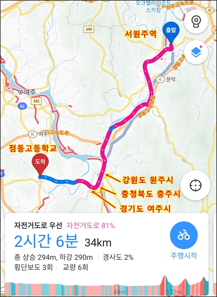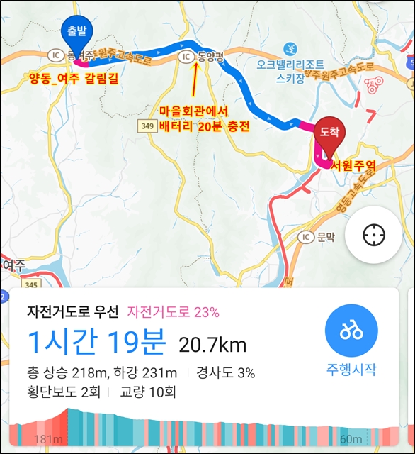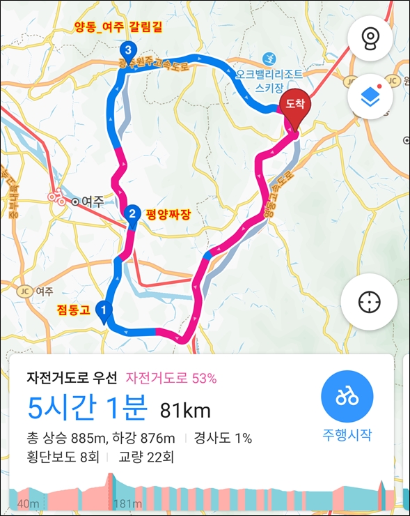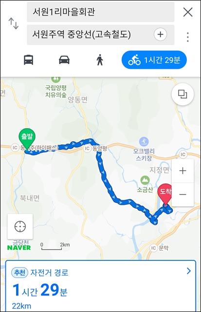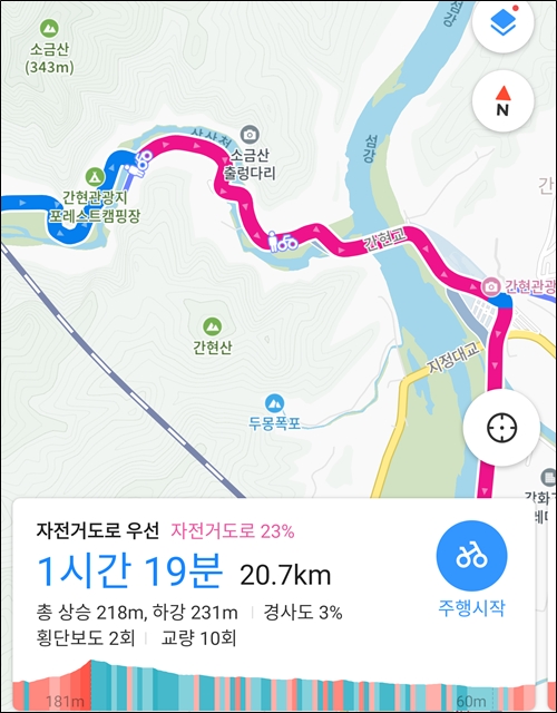 카카오맵은 삼산천을 따라 간현유원지 통과하라고 안내