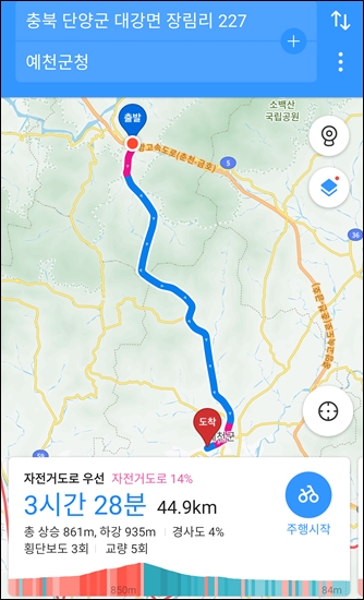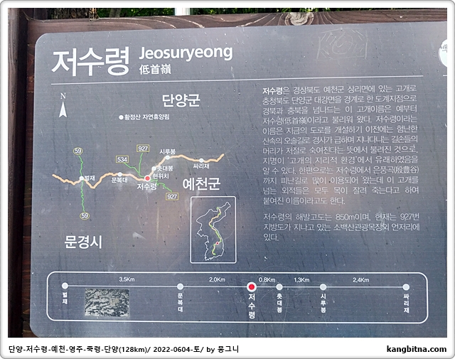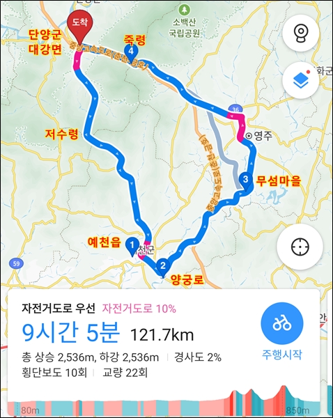 단양 대강면-저수령-예천읍-양궁로-내성천-영주 무섬마을-서천-영주-풍기-죽령-단양 대강면