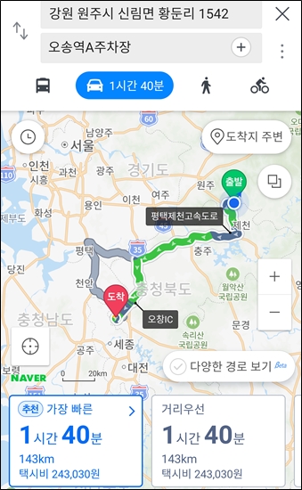 캠핑장에서 오송역까지는 143km
