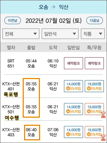 401은 목포행, 501은 여수행