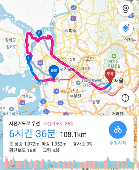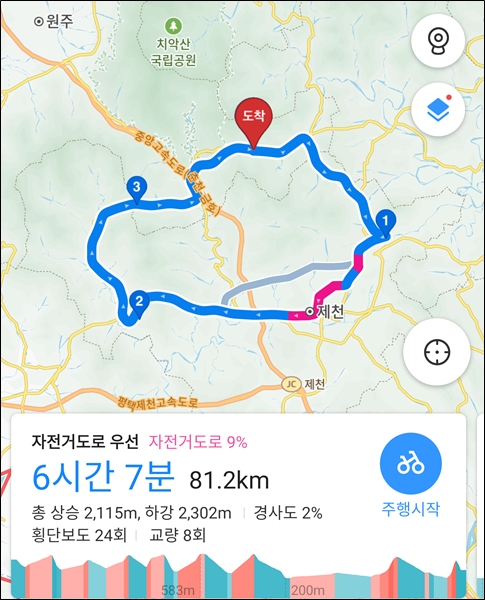 캠핑장에서 출발하여 캠핑장으로 돌아오는 동네 한 바퀴 코스 선택