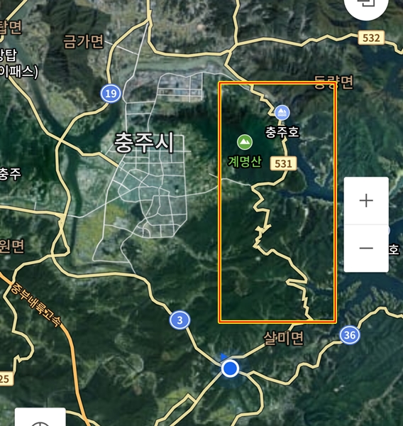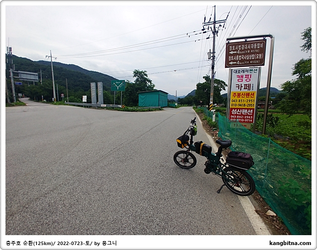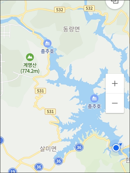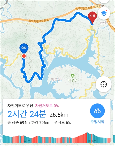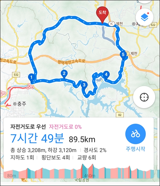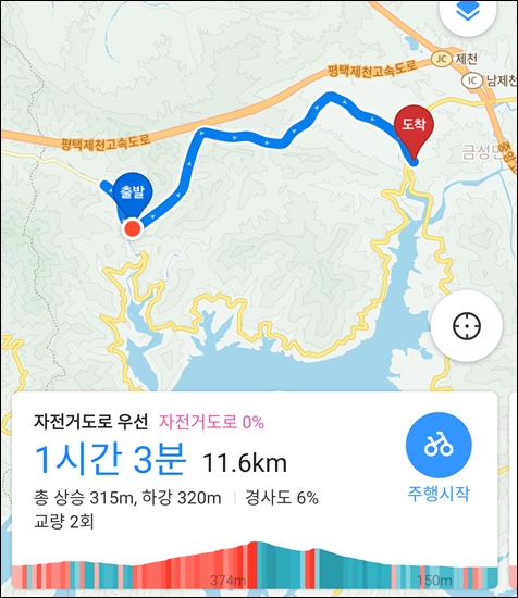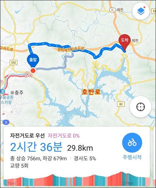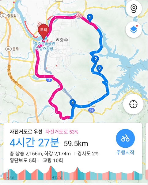 카카오맵은 충주시내 자전거도로를 통해 동량면 가는 것을 권유