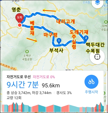 길이와 경사도 모두 최고난이도의 주실령 업힐 이었음.