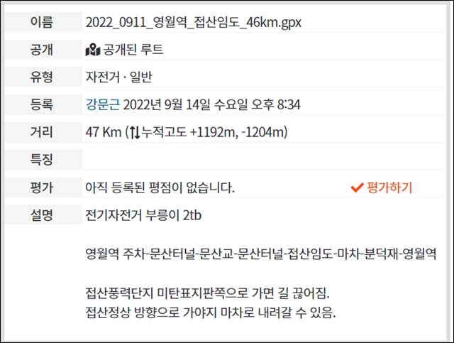 | [2tb][2022-0903-토] 미탄면-청옥산-백룡동굴(56km) (0) | 2022.09.04 |
