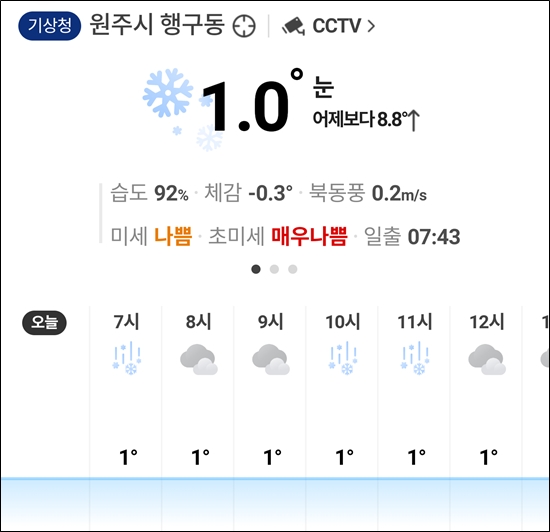 토요일 아침 눈은 거의 그치고 기온은 영상
