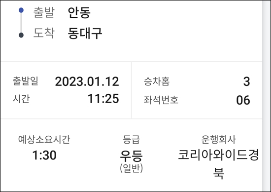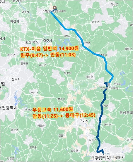 안동까지 기차로 가고 안동에서 버스로 동대구로 가기로 결정