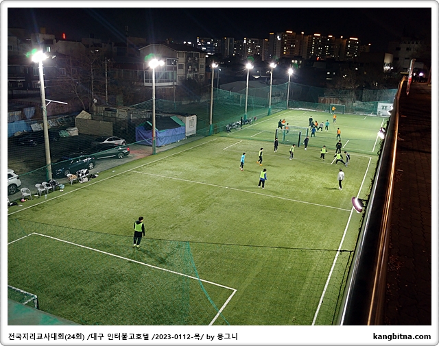 밤에 야외에서 축구를 한다.