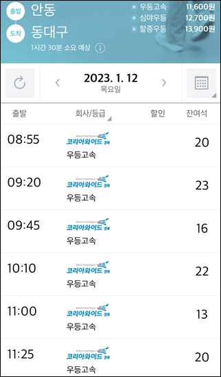 안동에서 동대구 가는 우등고속은 11시 25분 출발