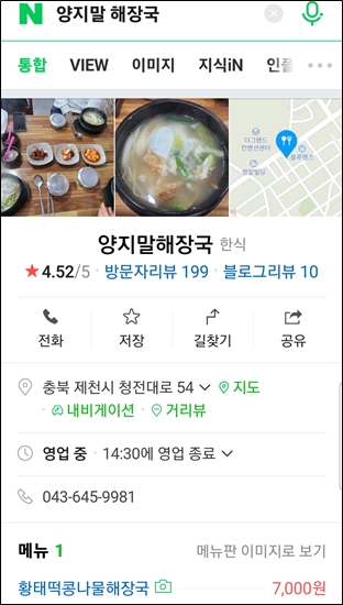 황태가 들어간 콩나물 해장국 단품만 판매한다. 7천원