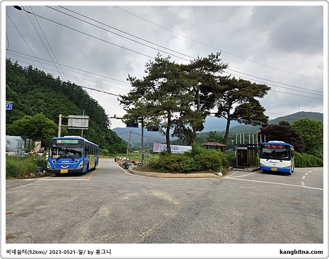 원주시쪽에 충주 시내버스가 정차해 있고, 오른쪽 충주시쪽에 파란핵 원주시 시내버스가 정차해 있다.