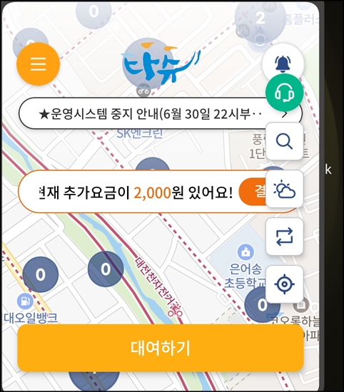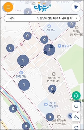 타슈 앱을 켜면 주변에 이용가능한 자전거들이 나온다.