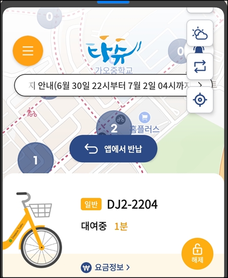 타슈 앱을 켜면 주변에 이용가능한 자전거들이 나온다.