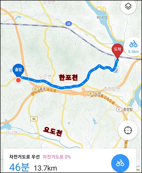 카카오맵에서는 노은에서 산을 넘어서 앙성으로 가는 길을 안내함.