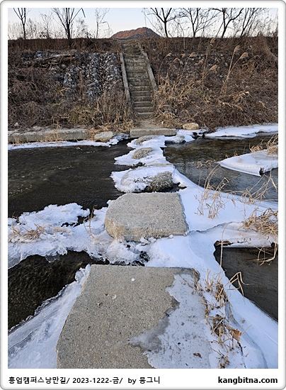 징검다리 일부에 얼음이 얼어 있어