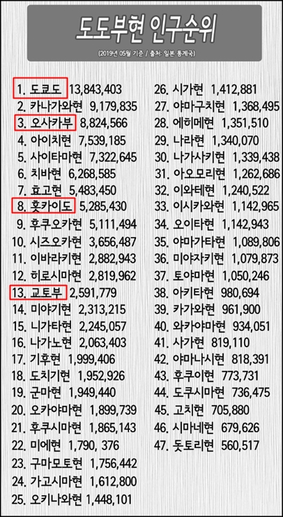 도쿄를 빼고 순위를 매김