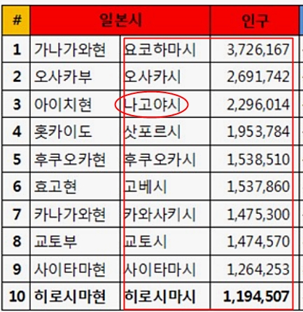 도쿄를 포함하면 나고야는 인구 4위다.