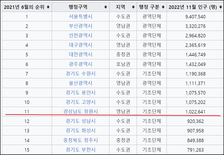 대한민국의 인구순 도시 목록 - 위키백과, 우리 모두의 백과사전