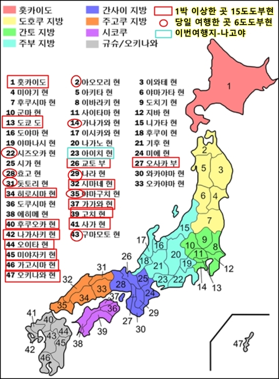 47개의 도도부현 중 1박 이상한 곳 15곳, 당일여행한 곳 7곳해서 22 곳을 여행했다.