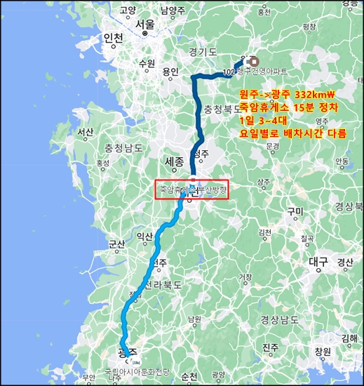 원주에서 광주는 330km 내외