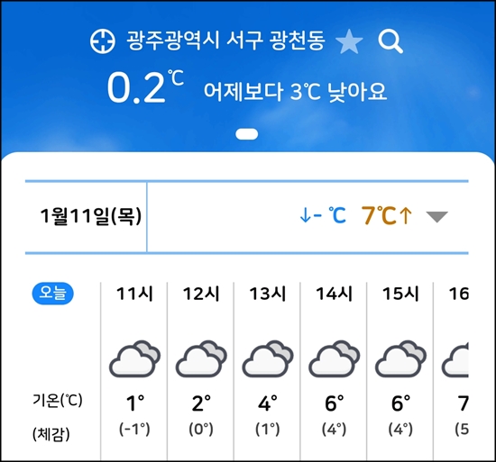 기온을 검색해보니 광주는 아침에는 0도, 낮에는 7도 내외다.