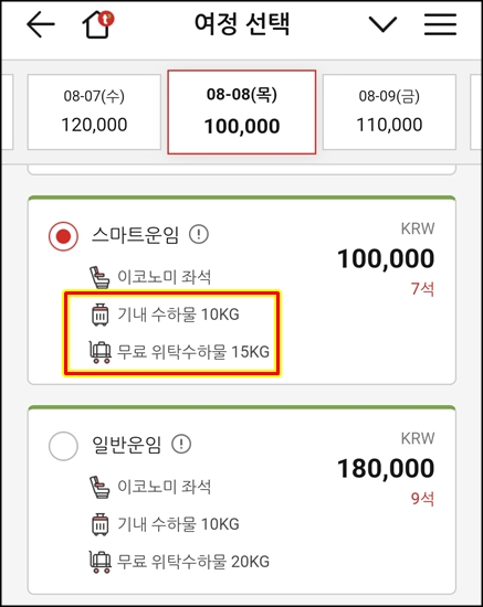 1일 출국, 8일 입국으로 예약