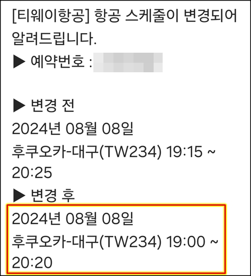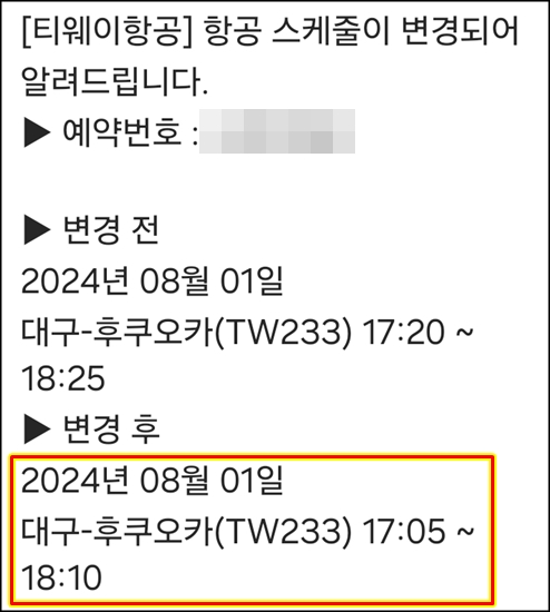 7월 30일 항공시간변경 카톡으로 옴.