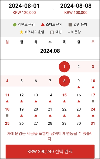 마침 목요일이 가장 저렴하다.