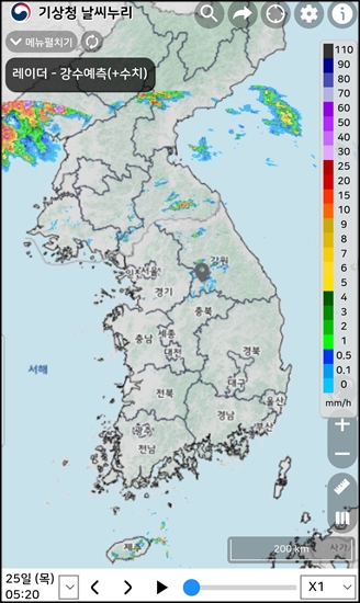 남한지역은 대체로 맑은데 원주부근에만 구름이...