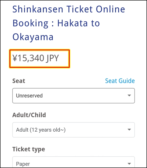 하카타역에서 오카야마역까지 편도 신칸센 요금이 15,340엔.