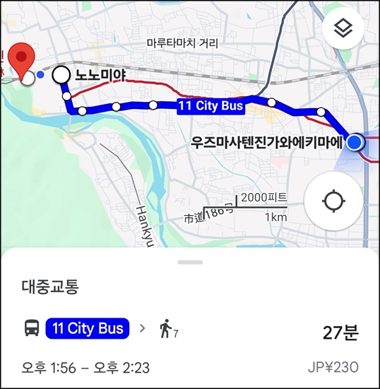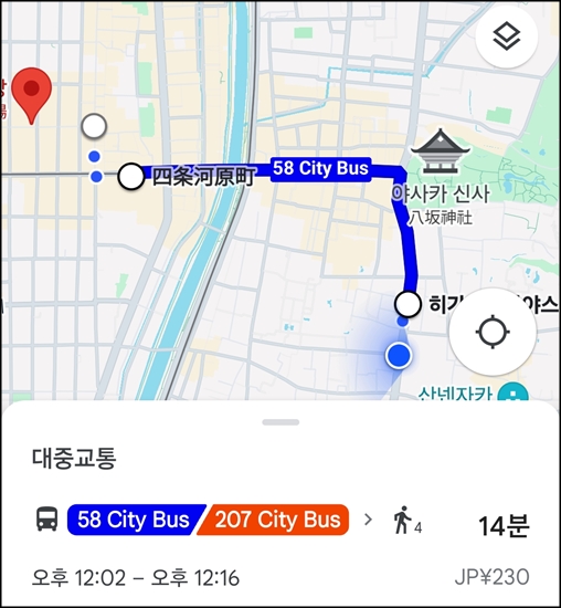 207번 버스를 타고 청수사에서 가와라마치로 이동