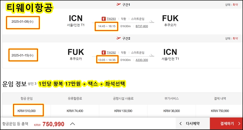추가로 자리 선택에 1인당 왕복 12,000원 지출.