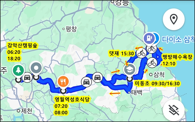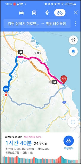 맹방해수욕장에서 삼척시내거쳐서 미로중학교까지 가는 코스